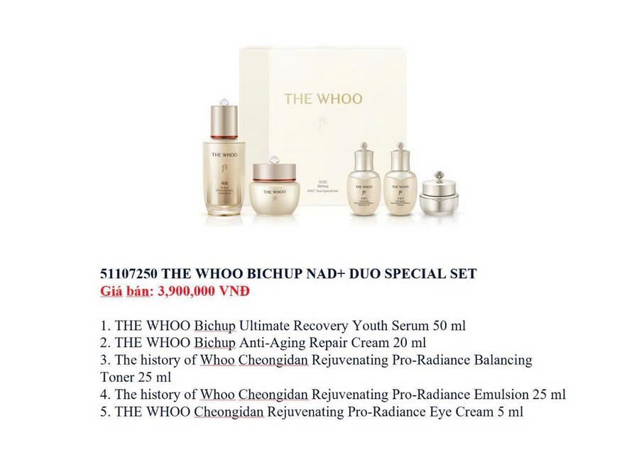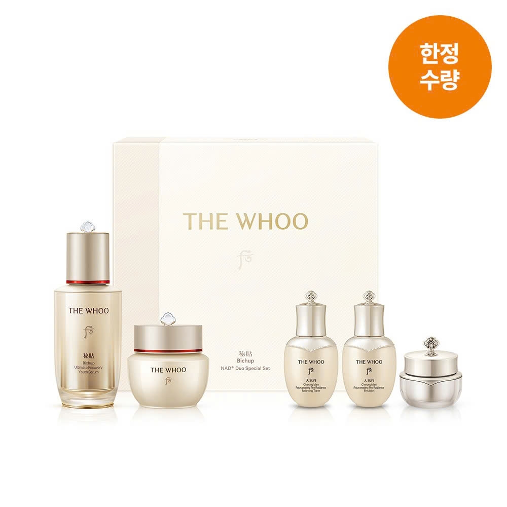 Whoo Bichup NAD⁺ Duo Special Set là bộ dưỡng da cao cấp đến từ thương hiệu mỹ phẩm hoàng cung The History of Whoo, nổi bật với công nghệ NAD⁺ độc quyền – bí quyết phục hồi năng lượng tế bào, tái sinh làn da và ngăn ngừa lão hóa sớm. Bộ set mang lại làn da căng sáng, đều màu, tràn đầy sức sống.